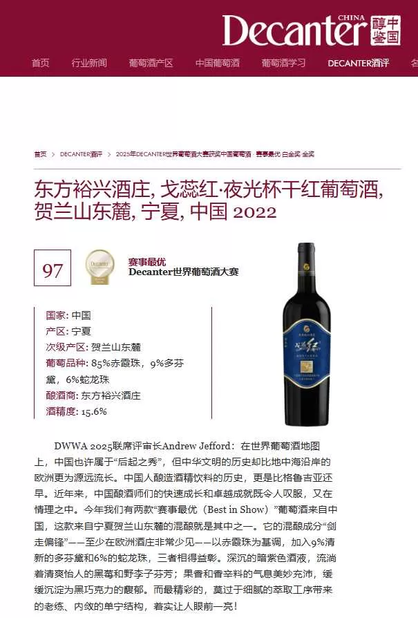 在2025年的Decanter(品醇客)世界葡萄酒大赛中,一家来自贺兰山东麓产区最南端红寺堡子产区的小酒庄——东方裕兴酒庄创造传奇:不仅以"戈蕊红2022夜光杯"斩获我国9年来首个"赛事最优"荣誉(高于白金奖,获奖率仅为0.3%),"戈蕊红2024马瑟兰"还获得最优性价比金奖,另有3款产品获银奖、1款获铜奖,成为宁夏产区在本届赛事中表现耀眼的酒庄,也印证了红寺堡作为优质产区的巨大潜力。